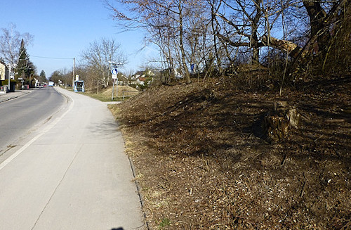 Nach ca. 4 Jahren zeigt das linke Bild das andere Extrem zum obigen Bild 6 zur "Gefahrenstelle durch verdeckte Sicht". Vielleicht sollten mal die Strassenverkehrsbehoerde und das Gartenbaureferat gemeinsam mehr an menschliche situationsabhaengige Verhaltensweisen denken, anstatt sich nur auf Gebote zurueckzuziehen, besonders wenn auch Kinder davon betroffen sein koennen. Es soll manchmal schon helfen, wenn man sich die Situation vor Ort, also in der Realitaet, direkt anschaut.